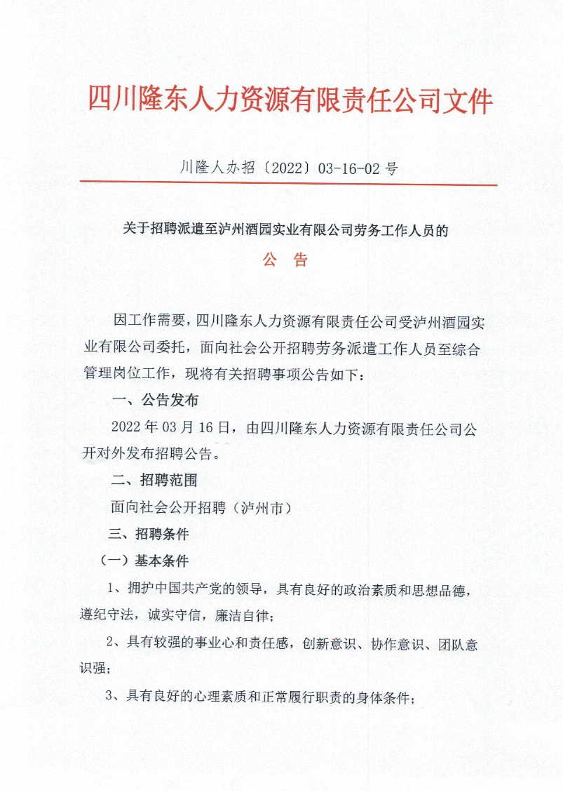 關(guān)于招聘派遣至瀘洲酒園實(shí)業(yè)有限公司勞務(wù)工作人員的公告