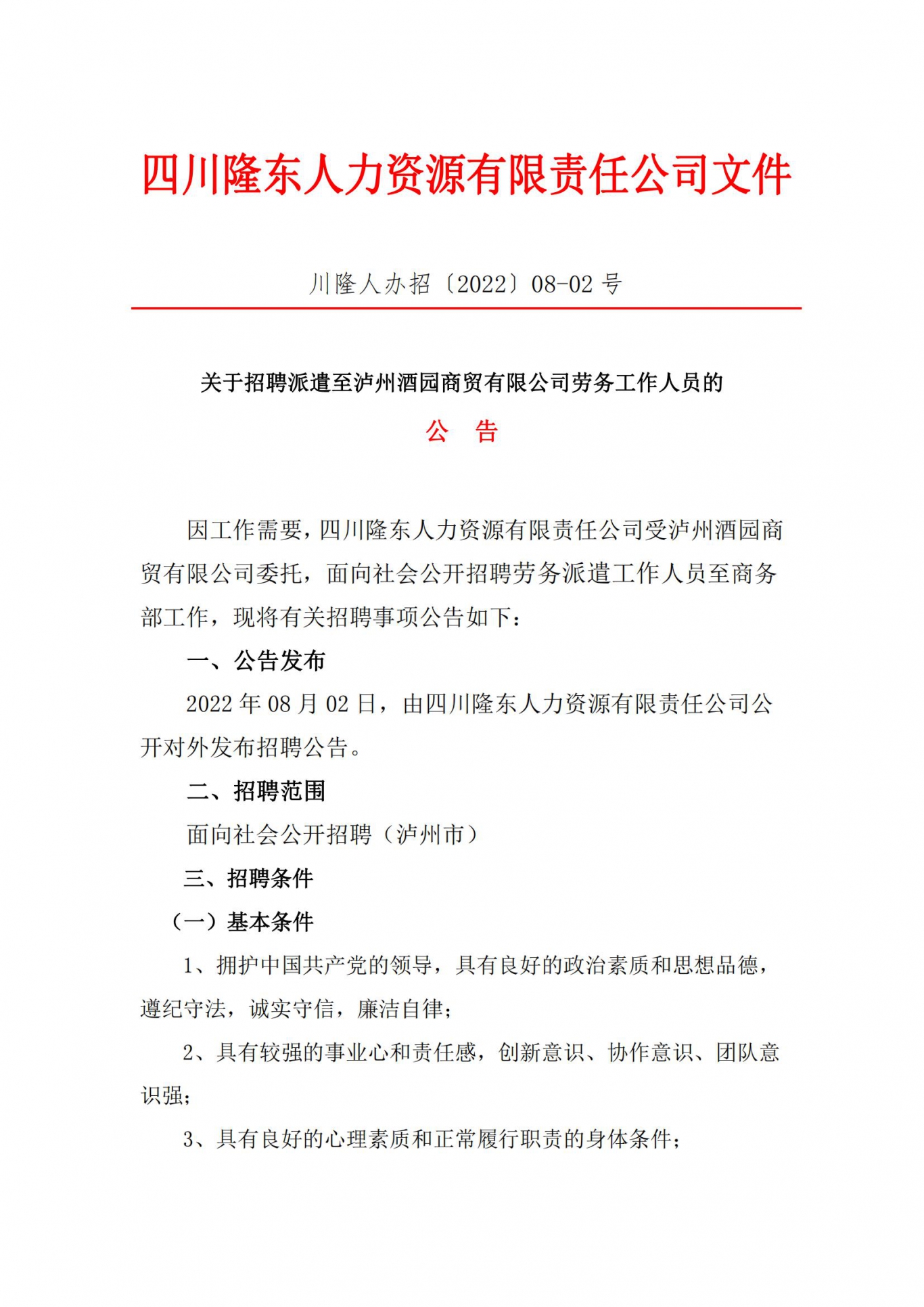 關(guān)于招聘派遣至瀘州酒園商貿(mào)有限公司勞務(wù)工作人員的公告