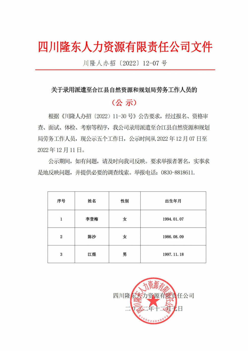 關(guān)于錄用派遣至合江縣自然資源和規(guī)劃局勞務(wù)工作人員的 (公 示)